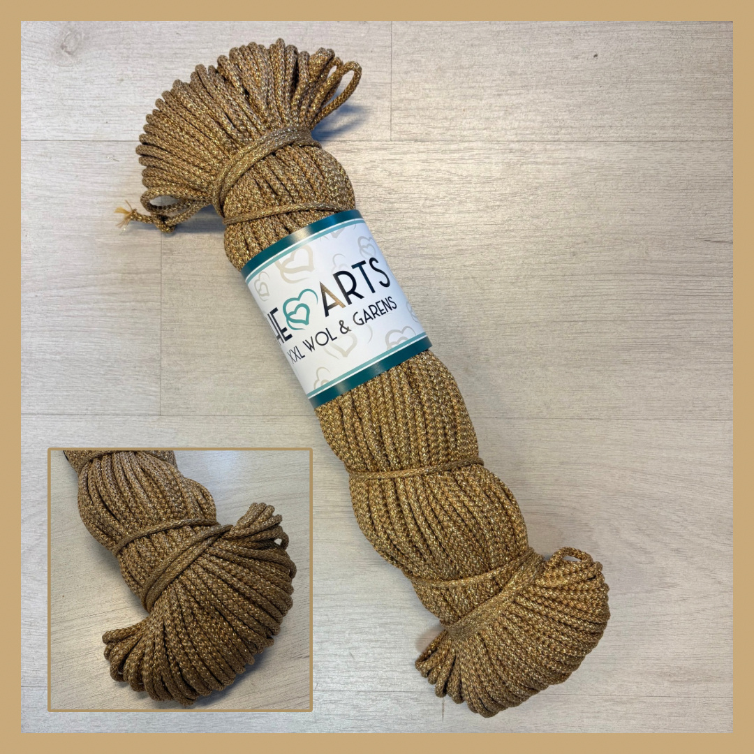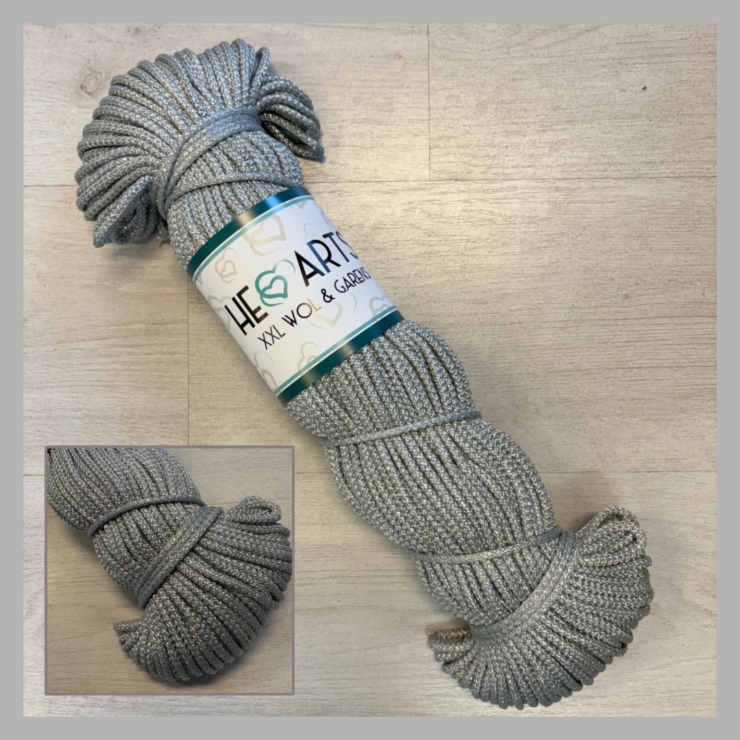 Op een streng Hearts Bling zit 100 meter en deze haak je op haaknaald 10. Het is een gevlochten draad van 5 mm dikte en bestaat uit heel veel lurex en polyester.