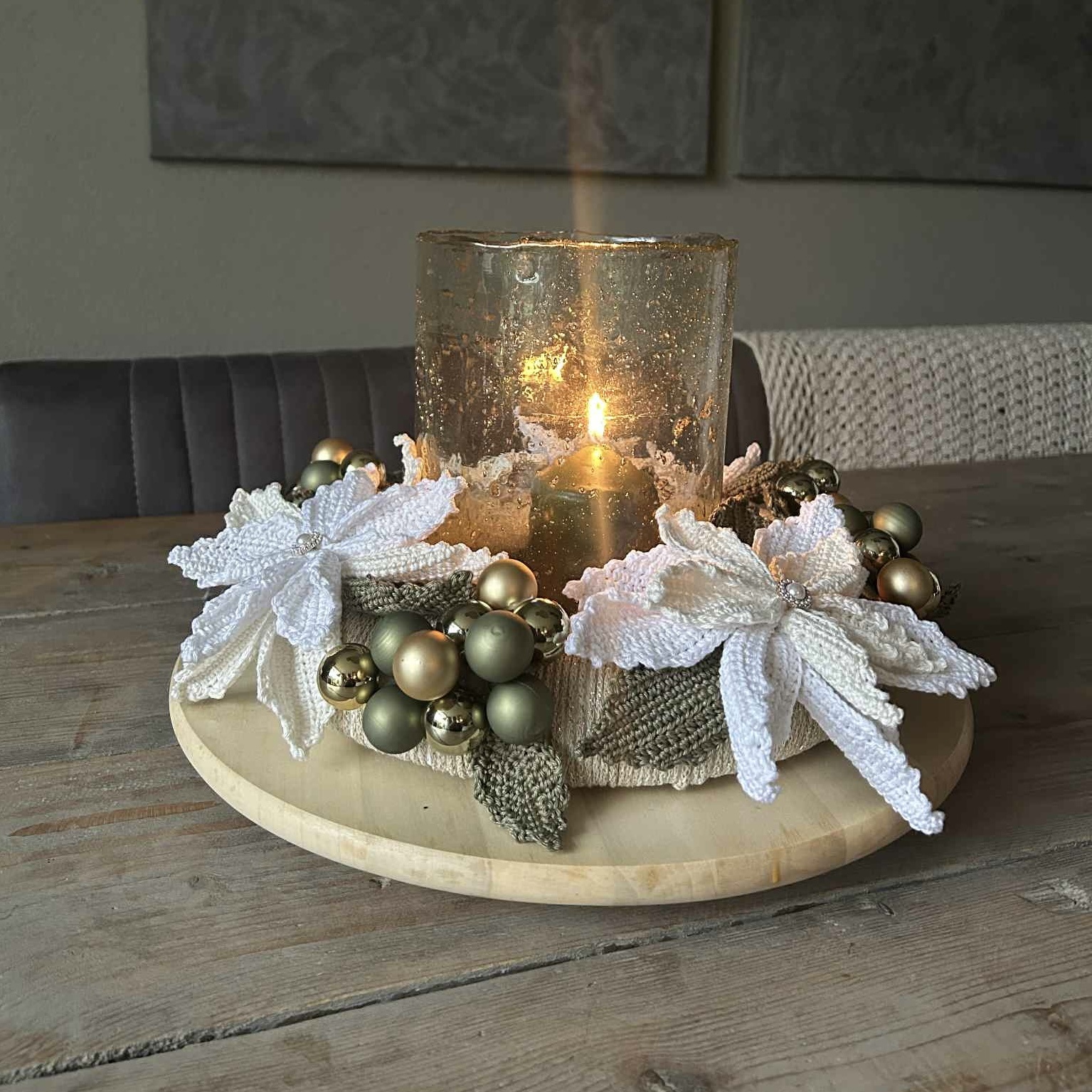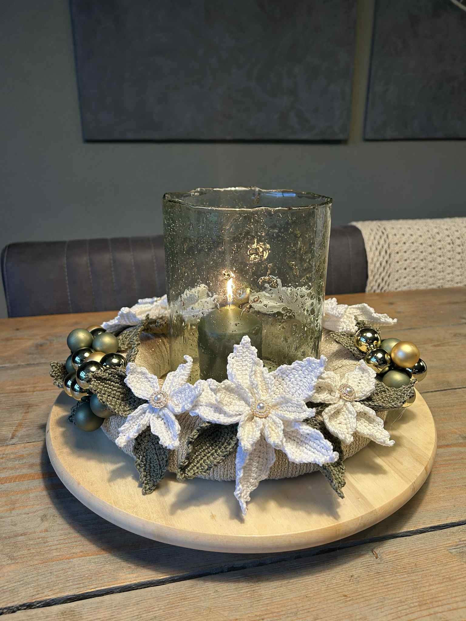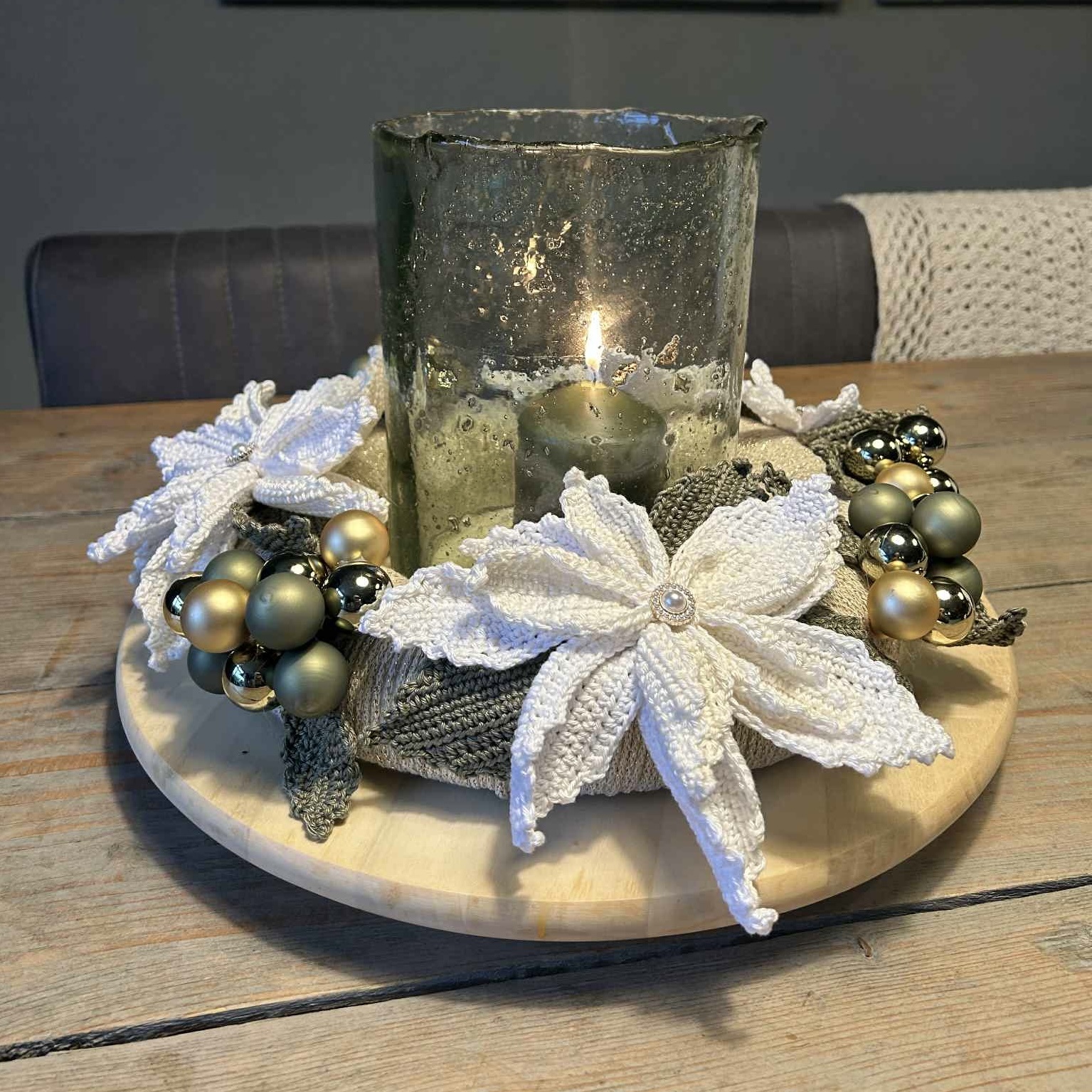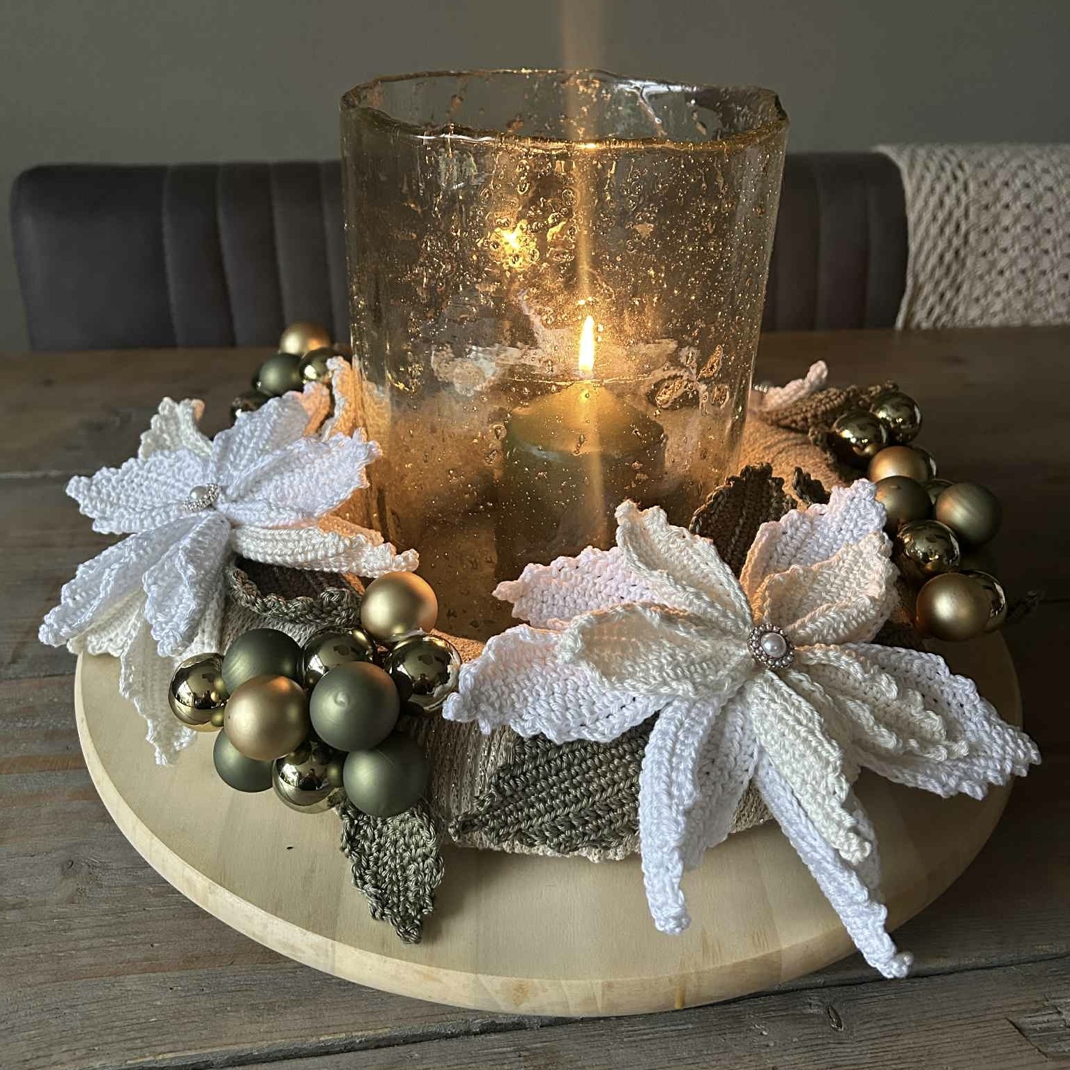Het haakpakket van de krans met kerststerren is er in 2 kleurcombinaties. Er is een pakket met twee kleuren rood en donkergroen voor de blaadjes en er is een pakket met wit en marble en olijfgroen voor de blaadjes. Beide pakketten bestaan uit een styroporkrans van 30 cm. Leuk om op tafel neer te zetten met een kaars in het midden, maar ook leuk om op te hangen. Alles zit bij het pakket inbegrepen, behalve de kleine kerstballen. Je kunt deze toevoegen aan de krans naar eigen smaak, maar ook leuk om er echt kerstgroen in te prikken. De krans bij het rode pakket wordt omwikkeld met melange groene Hearts mini. De lichte krans met wit wordt omwikkeld met een lichte naturel/zand Hearts mini met daarin een gouddraadje. Het hart van de kerststerbloemen is een mooie parelknoop.