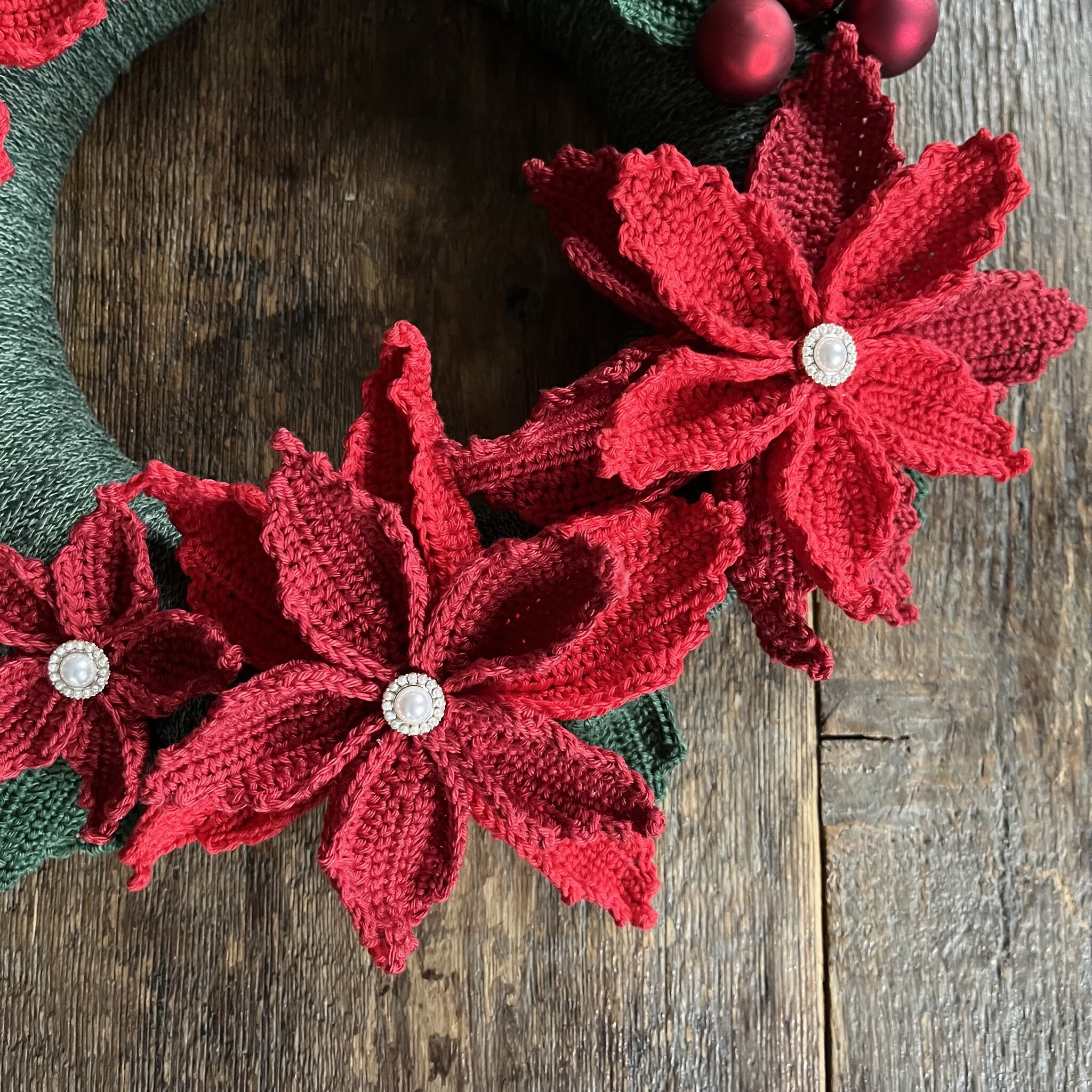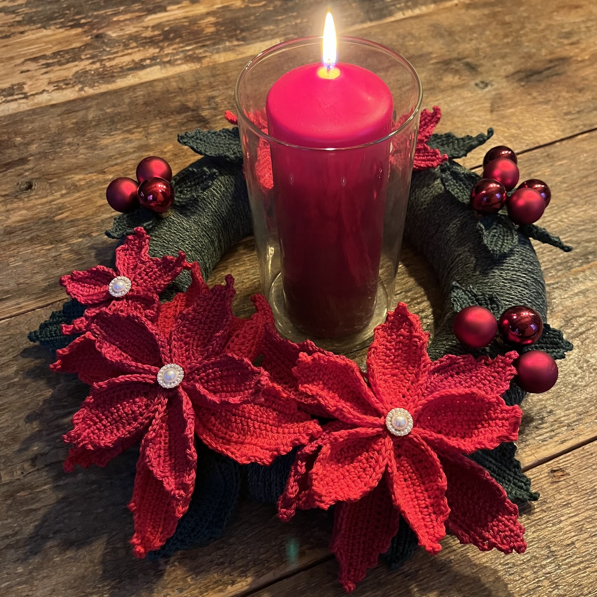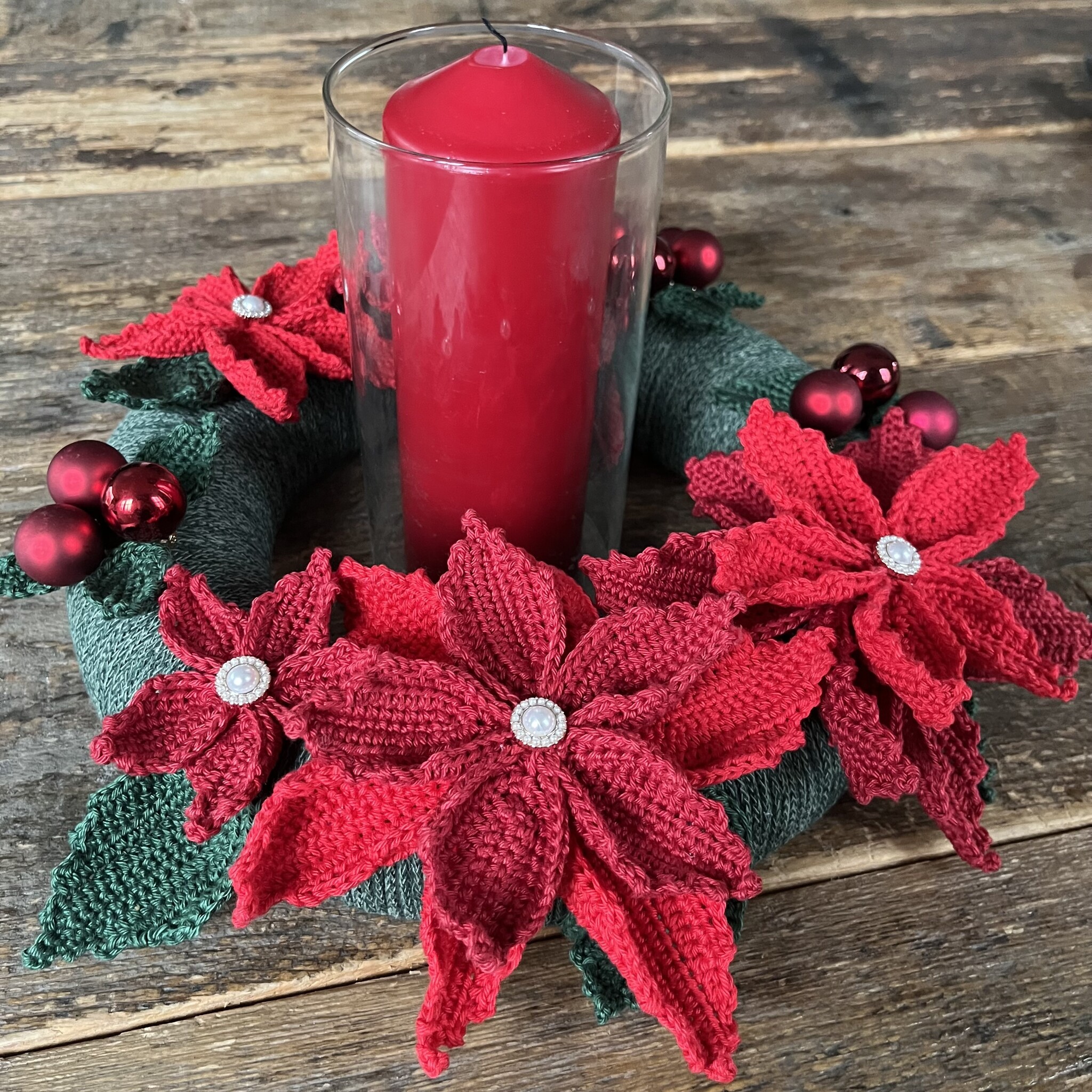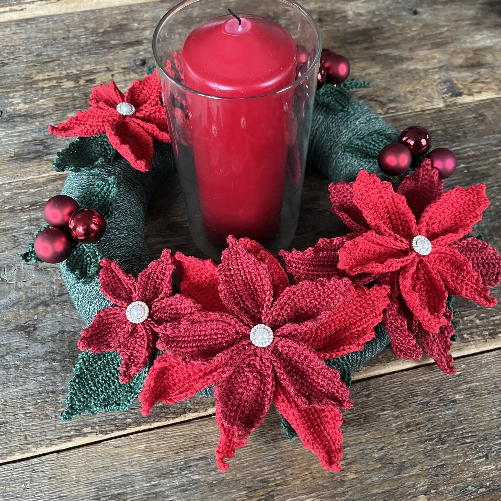 Het haakpakket van de krans met kerststerren is er in 2 kleurcombinaties. Er is een pakket met twee kleuren rood en donkergroen voor de blaadjes en er is een pakket met wit en marble en olijfgroen voor de blaadjes. Beide pakketten bestaan uit een styroporkrans van 30 cm. Leuk om op tafel neer te zetten met een kaars in het midden, maar ook leuk om op te hangen. Alles zit bij het pakket inbegrepen, behalve de kleine kerstballen. Je kunt deze toevoegen aan de krans naar eigen smaak, maar ook leuk om er echt kerstgroen in te prikken. De krans bij het rode pakket wordt omwikkeld met melange groene Hearts mini. De lichte krans met wit wordt omwikkeld met een lichte naturel/zand Hearts mini met daarin een gouddraadje. Het hart van de kerststerbloemen is een mooie parelknoop.