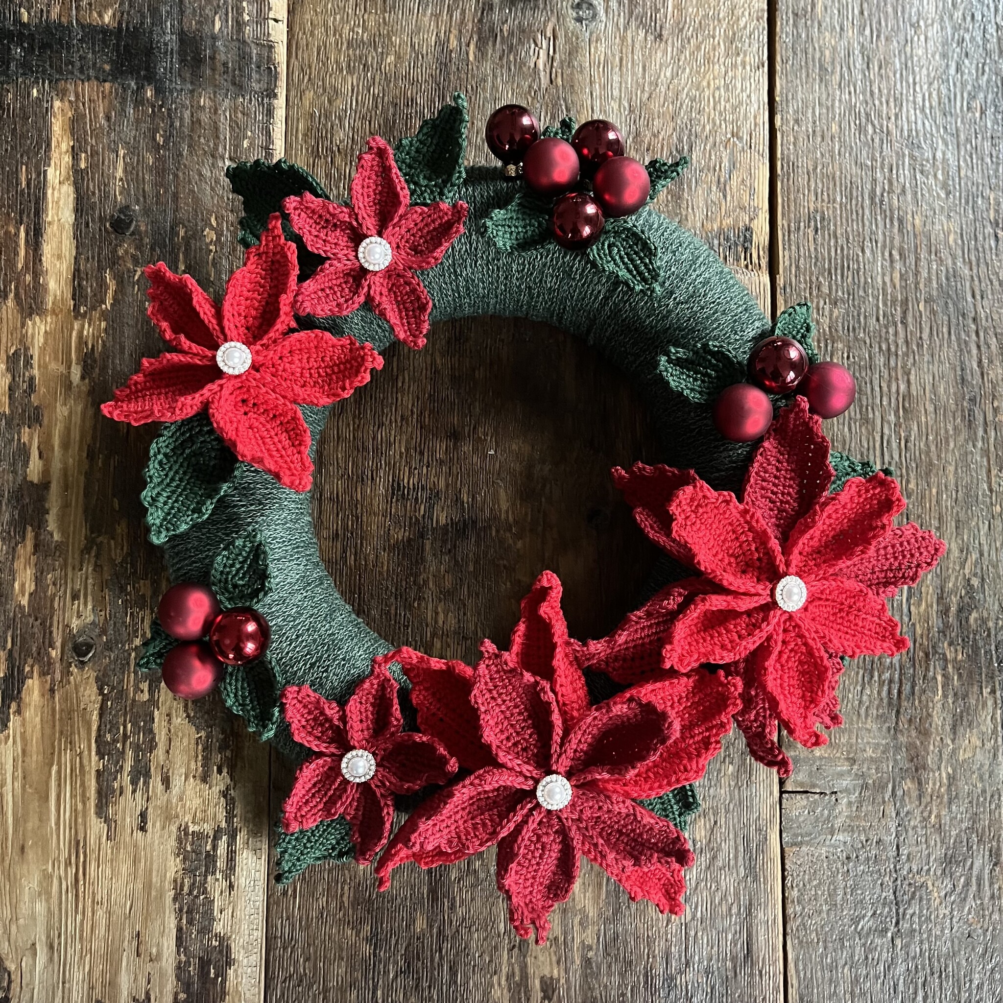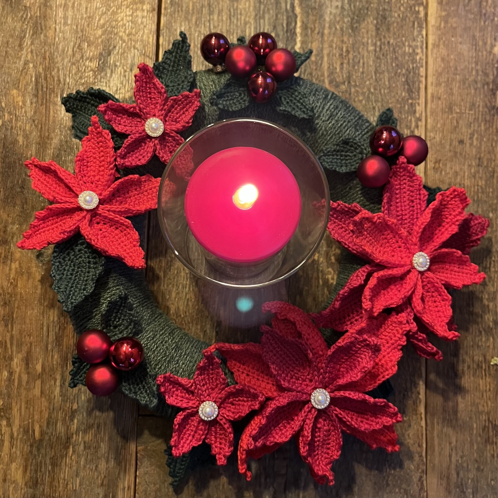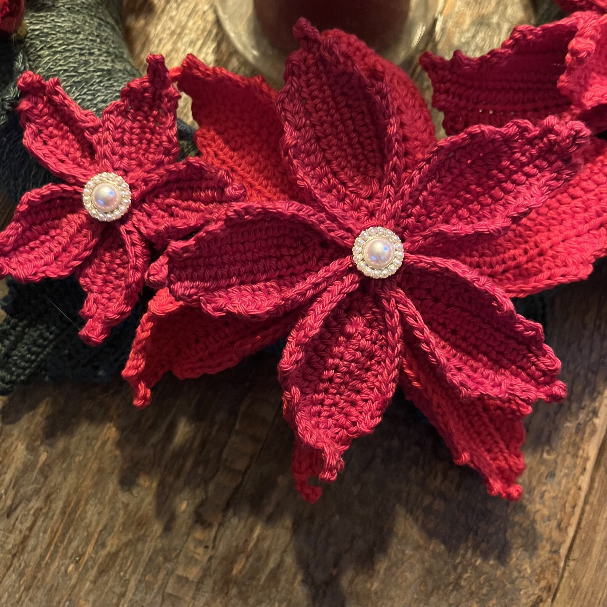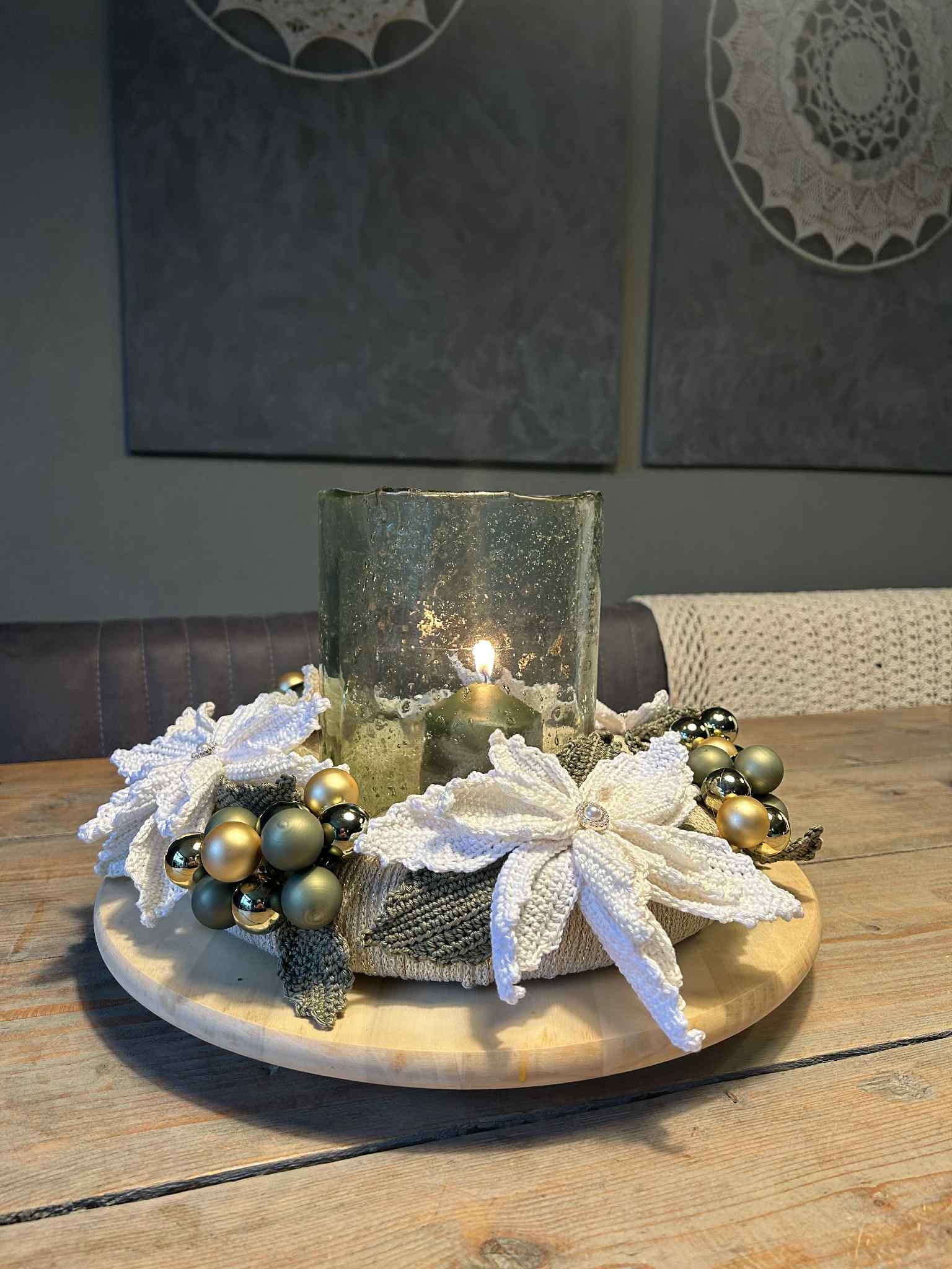 Het haakpakket van de krans met kerststerren is er in 2 kleurcombinaties. Er is een pakket met twee kleuren rood en donkergroen voor de blaadjes en er is een pakket met wit en marble en olijfgroen voor de blaadjes. Beide pakketten bestaan uit een styroporkrans van 30 cm. Leuk om op tafel neer te zetten met een kaars in het midden, maar ook leuk om op te hangen. Alles zit bij het pakket inbegrepen, behalve de kleine kerstballen. Je kunt deze toevoegen aan de krans naar eigen smaak, maar ook leuk om er echt kerstgroen in te prikken. De krans bij het rode pakket wordt omwikkeld met melange groene Hearts mini. De lichte krans met wit wordt omwikkeld met een lichte naturel/zand Hearts mini met daarin een gouddraadje. Het hart van de kerststerbloemen is een mooie parelknoop.