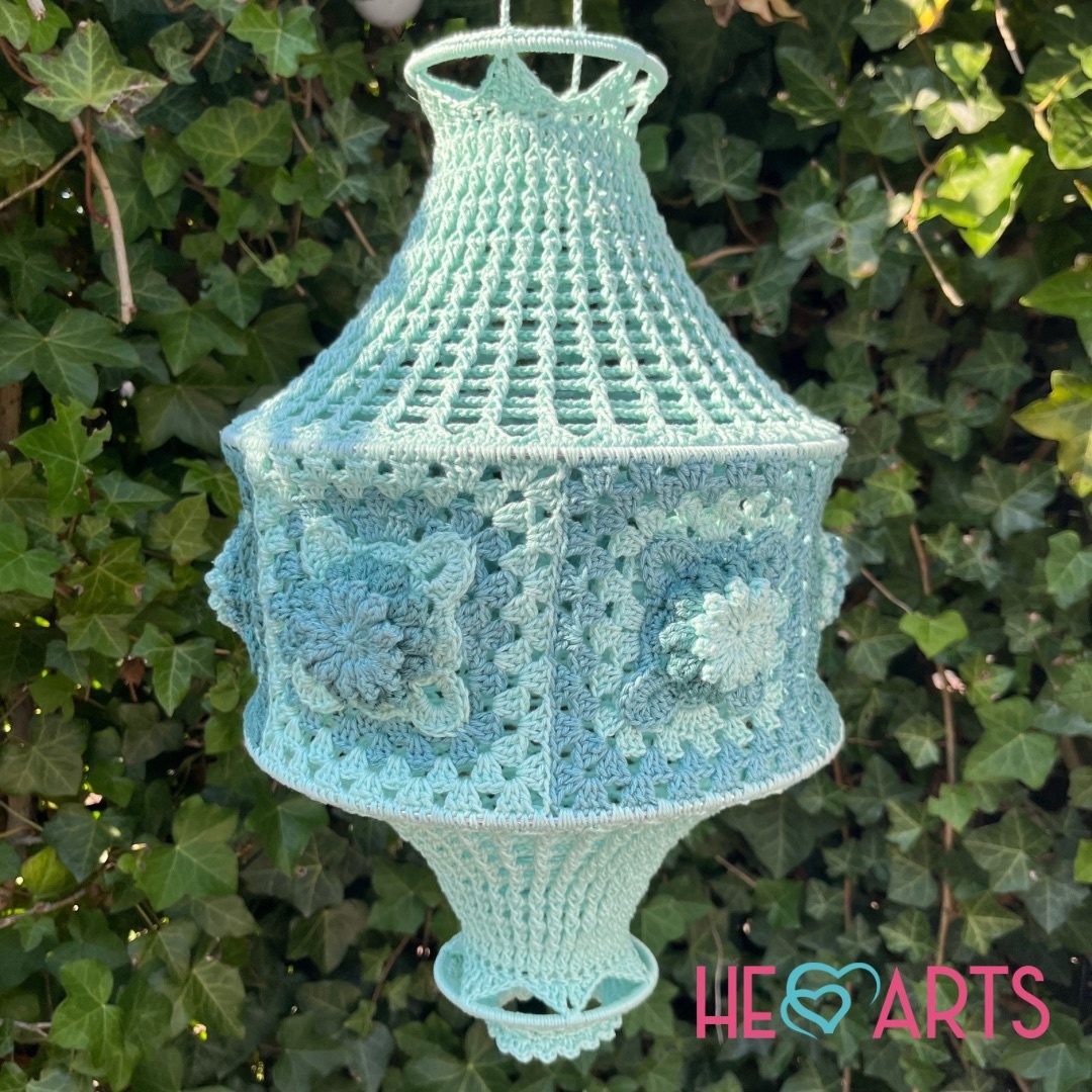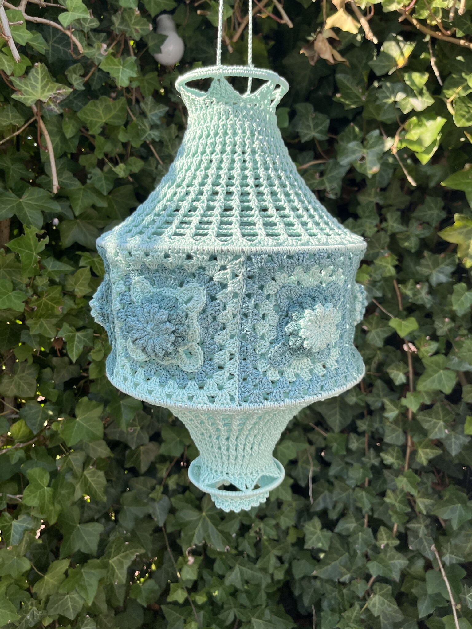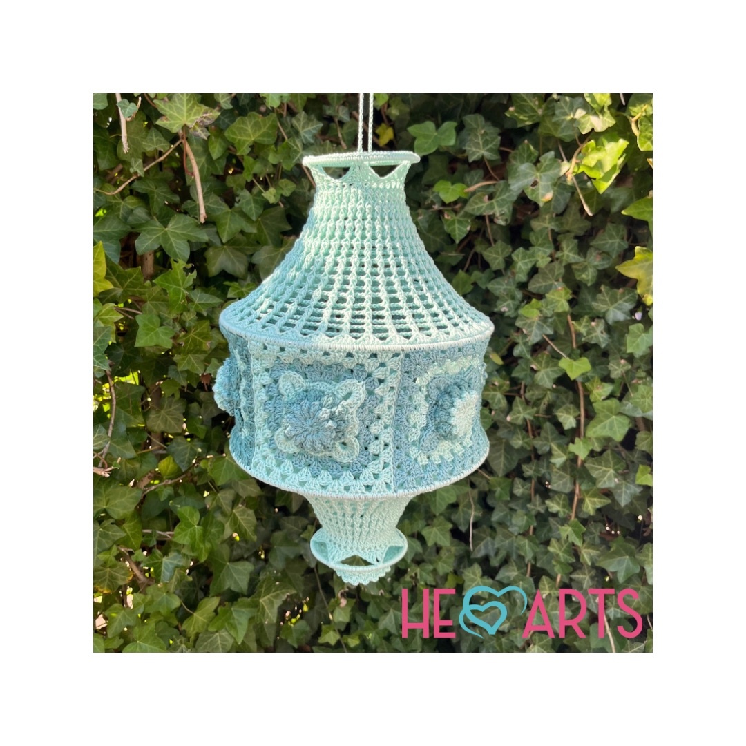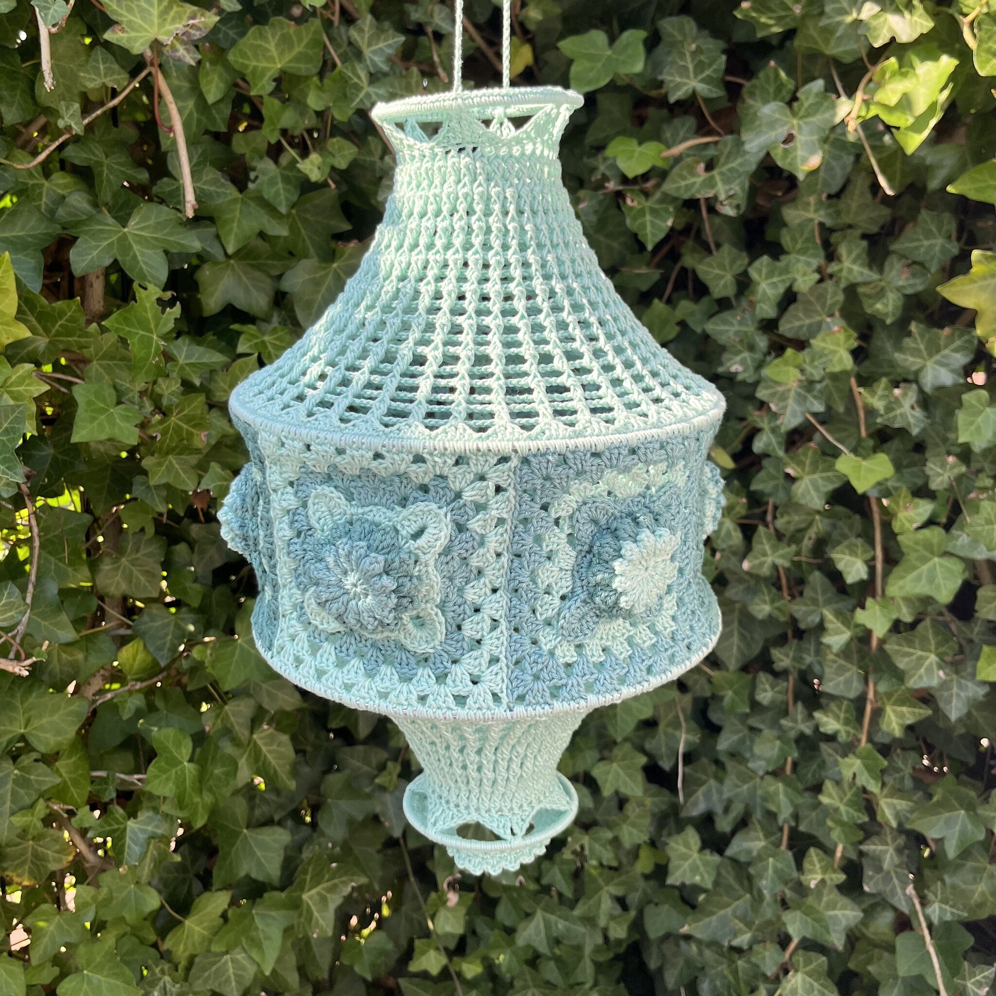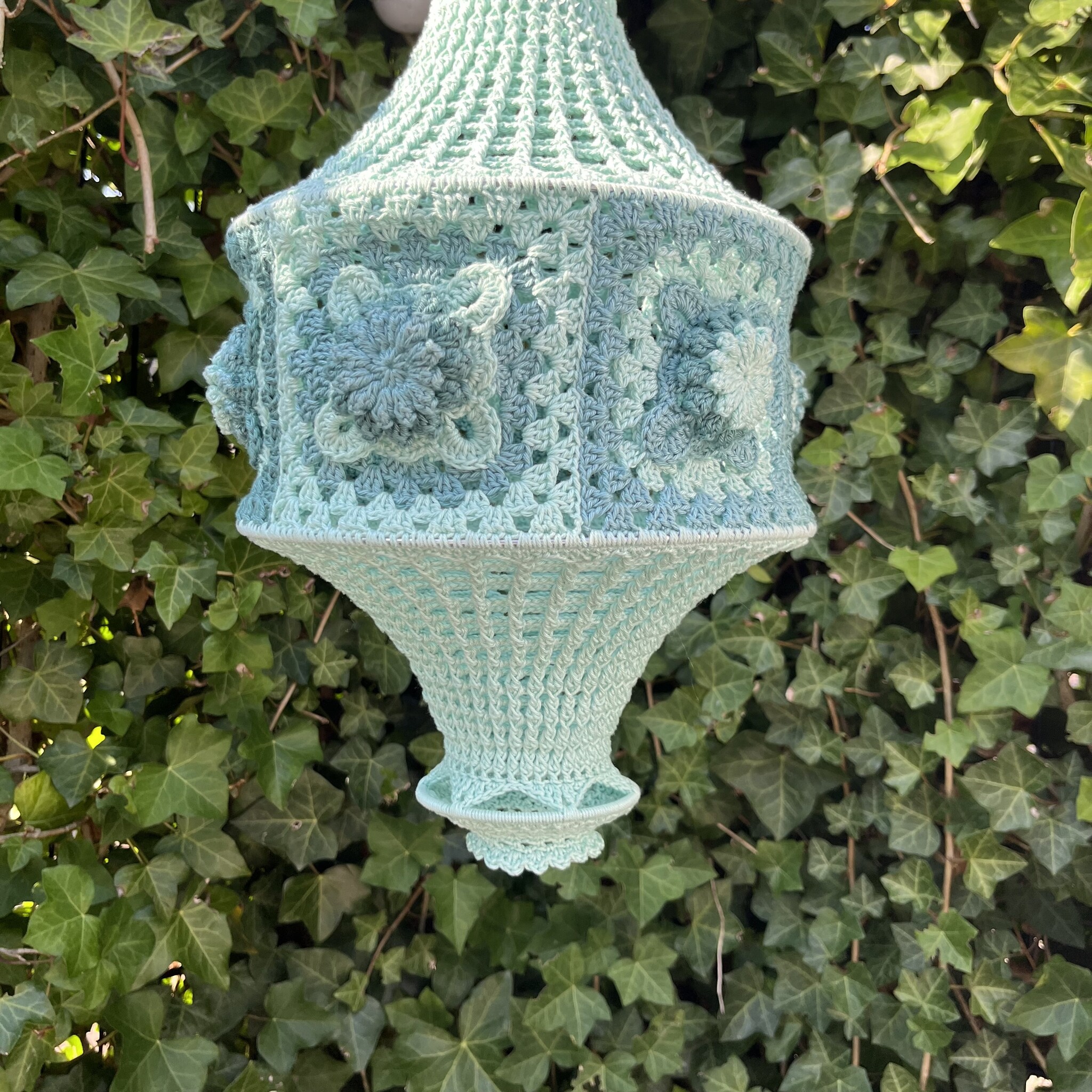 De granny kroonluchter is een zomerse kroonluchter met drie kleuren garen verwerkt in de reliëf granny’s Lees meer