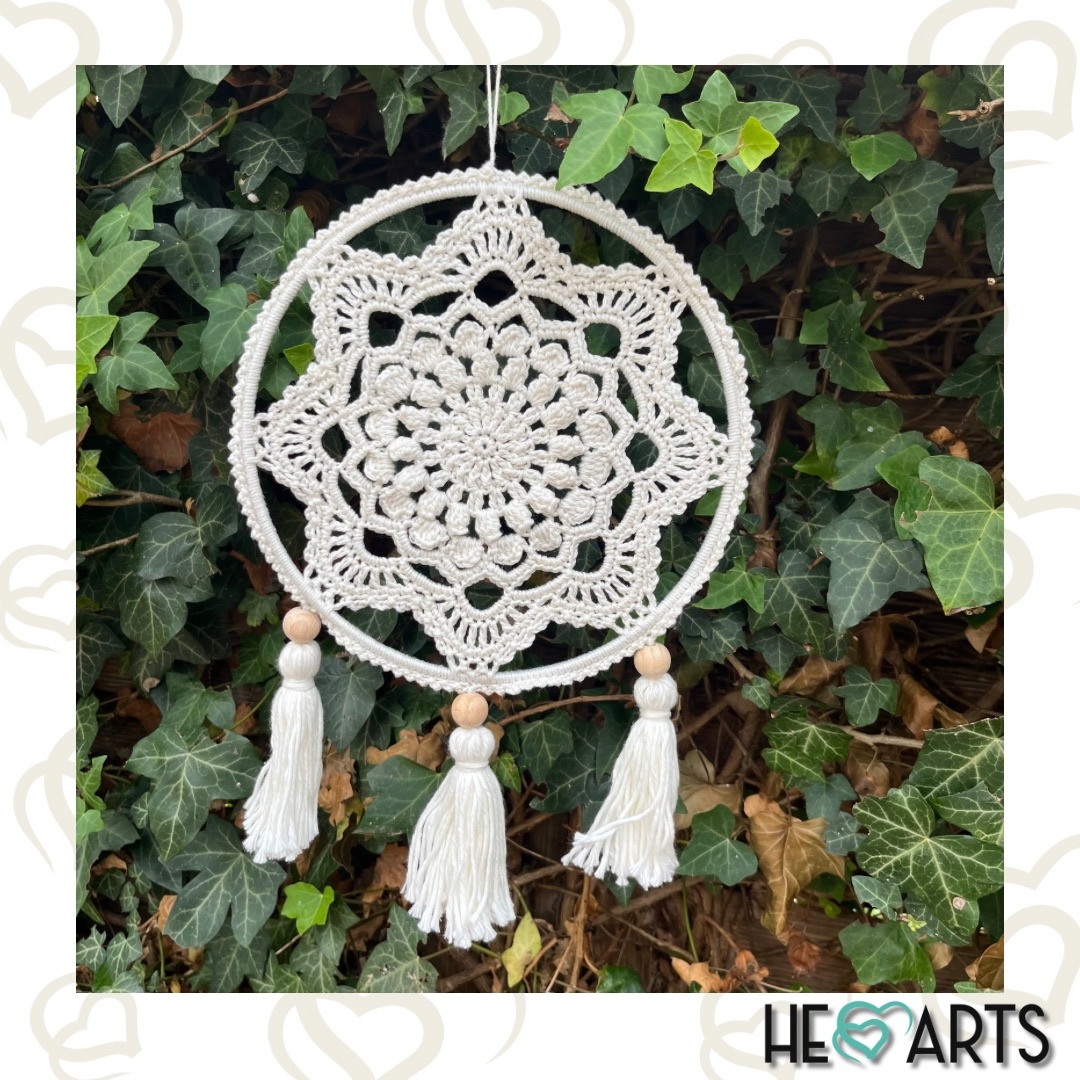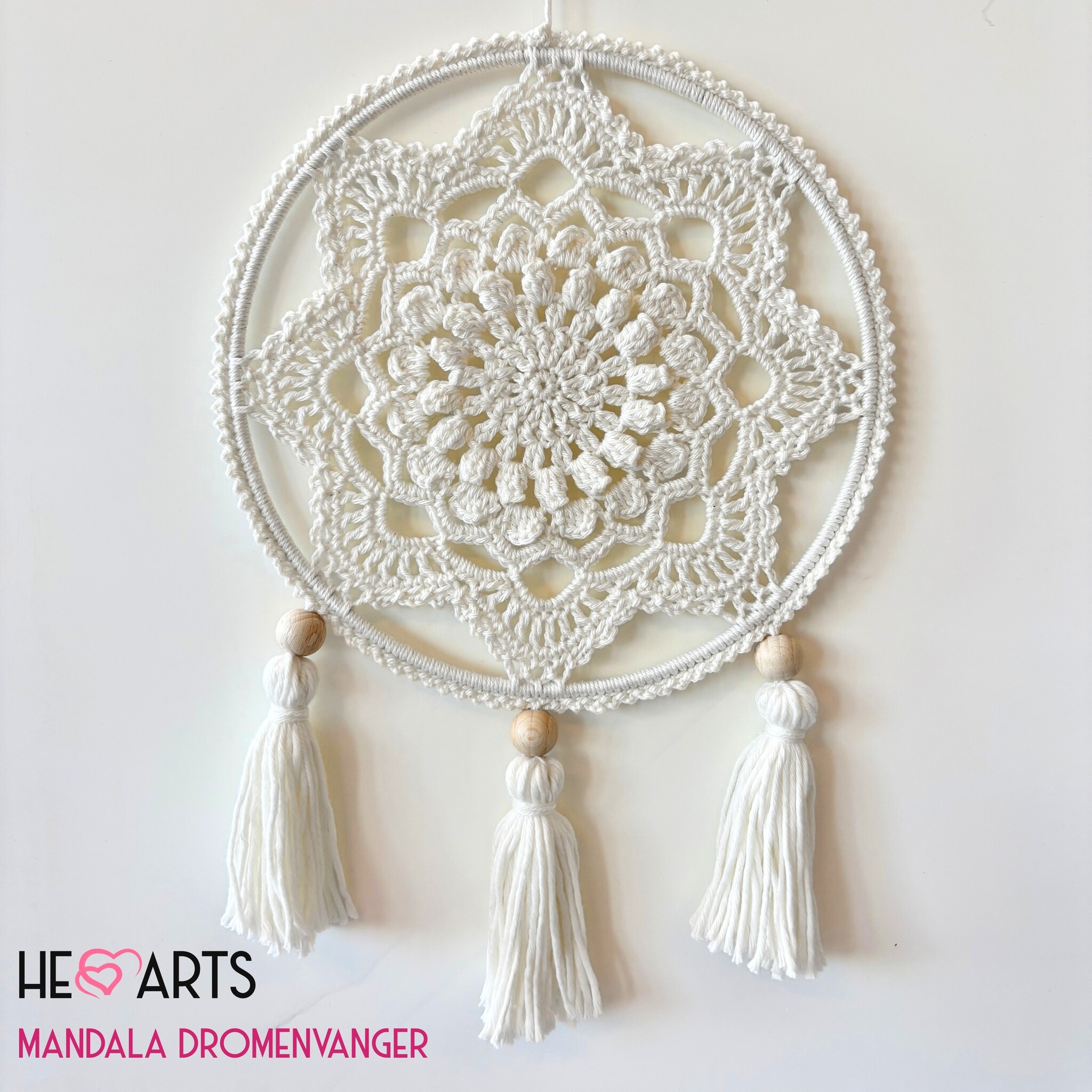 Mandala dromenvanger met kwastjes gehaakt van de Must-Have. De dromenvanger met kwastjes was een nderdeel van onze moederdagbox, nu ook los te koop inclusief garen, accessoires en patroon. De kleur van het garen kies je zelf. Voor alle kleuren kijk je bij de foto’s bij dit pakket. Daar staan alle kleuren afgebeeld of klik op deze link om naar de Must-have te gaan om het nog beter te bekijken