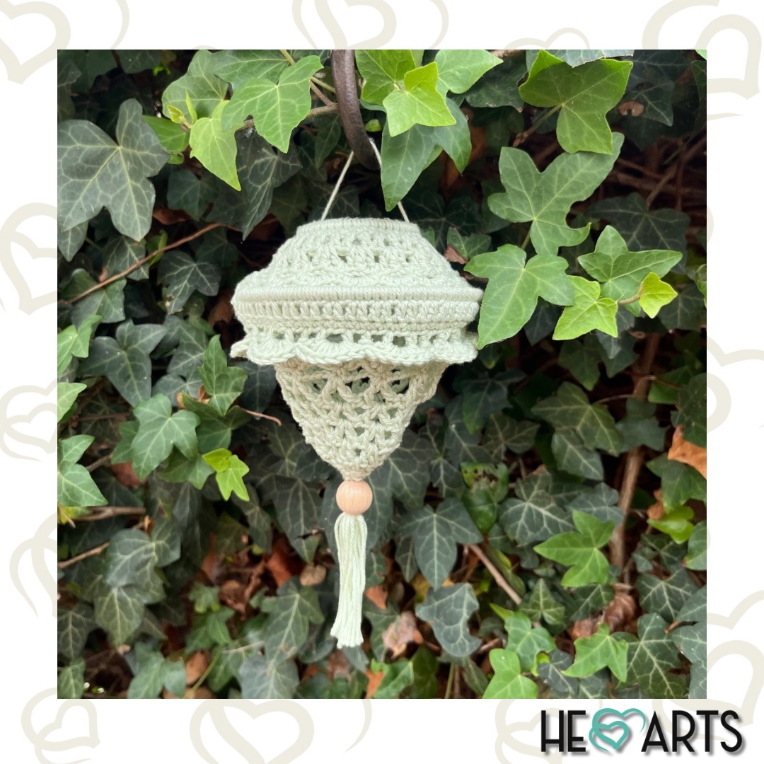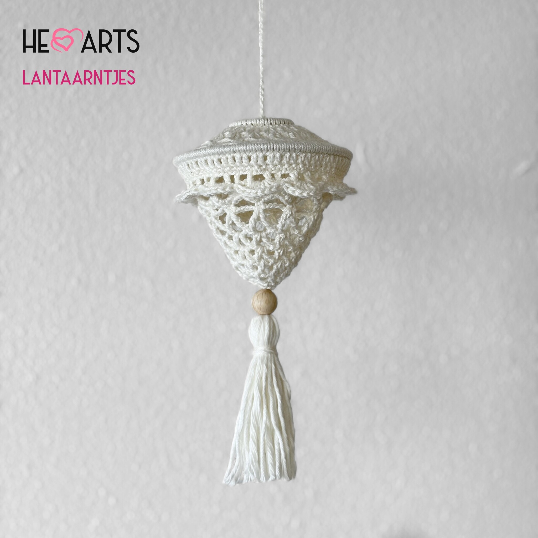 Een lantaarntje heeft een doorsnede van 10 cm, gehaakt met de Must-Have op haaknaald 2.5 mm, met kwastjes van houten kralen en de Must-Have