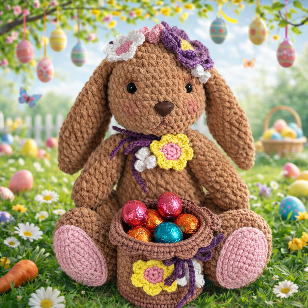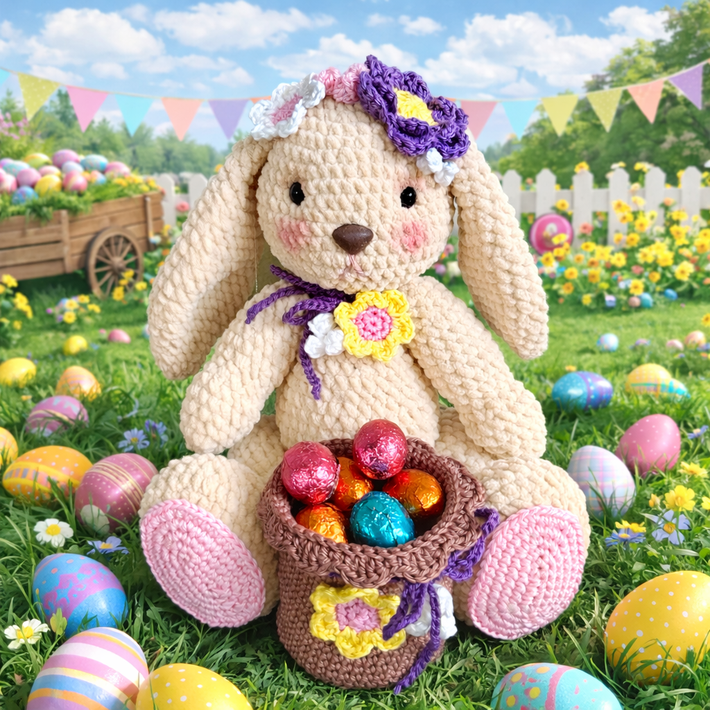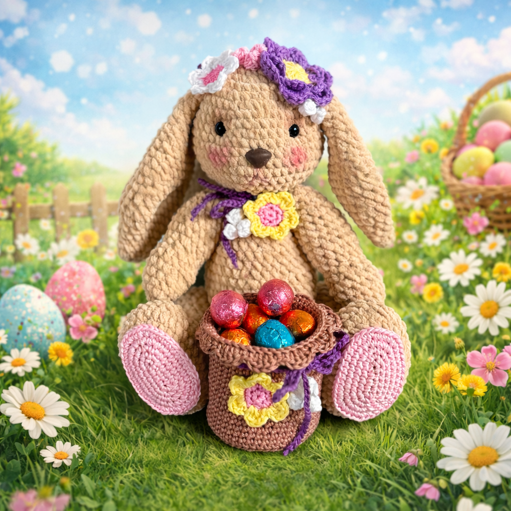Paas Konijntje Chenille is een haakpakket met chenille, alle accessoires en een patroon Lees meer