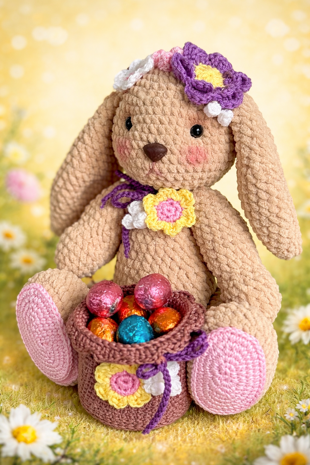 Het schattige Paas Konijntje is gehaakt met de Little Darling van Scheepjes of met de Chunky Chenille van Yarn and Colors. Je haakt de chenille op haaknaald 4 en het konijntje wordt opgefleurd met bloemetjes van de Must-have op haaknaald 2.5 mm. Een mandje wat je er los bijzet is ook gehaakt van de Must-have en deze kan je heerlijk vullen met paaseitjes. Een compleet pakket met alles in het pakket wat je nodig hebt om het konijntje te kunnen maken, ook de vulling is toegevoegd. Afmeting is ongeveer 25 cm hoog De kleur van het voorbeeld is Limestone. De andere twee kleuren Cream en Teddybear vind je bij de foto’s bij dit pakket. De kleuren van de bloemetjes en het mandje zijn voor alle kleuren gelijk