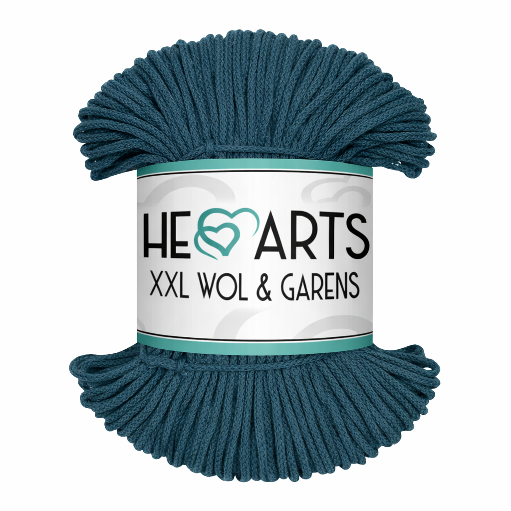 Zie hier de prachtige Hearts MINI 3MM in de kleur Petrol. Deze soepele gevlochten draad heeft een dikte van 3mm en is voor veel creatieve doeleinden geschikt. Met dit katoenen garen kun je haken, breien of knopen. De draad is wasbaar en daarom ideaal voor het maken van allerlei woonaccessoires zoals kussens, wandhangers of manden. Het Hearts MINI garen is niet uitkambaar. Voor het beste resultaat raden we het gebruik van haak- of breinaalden nr. 5/6 aan.