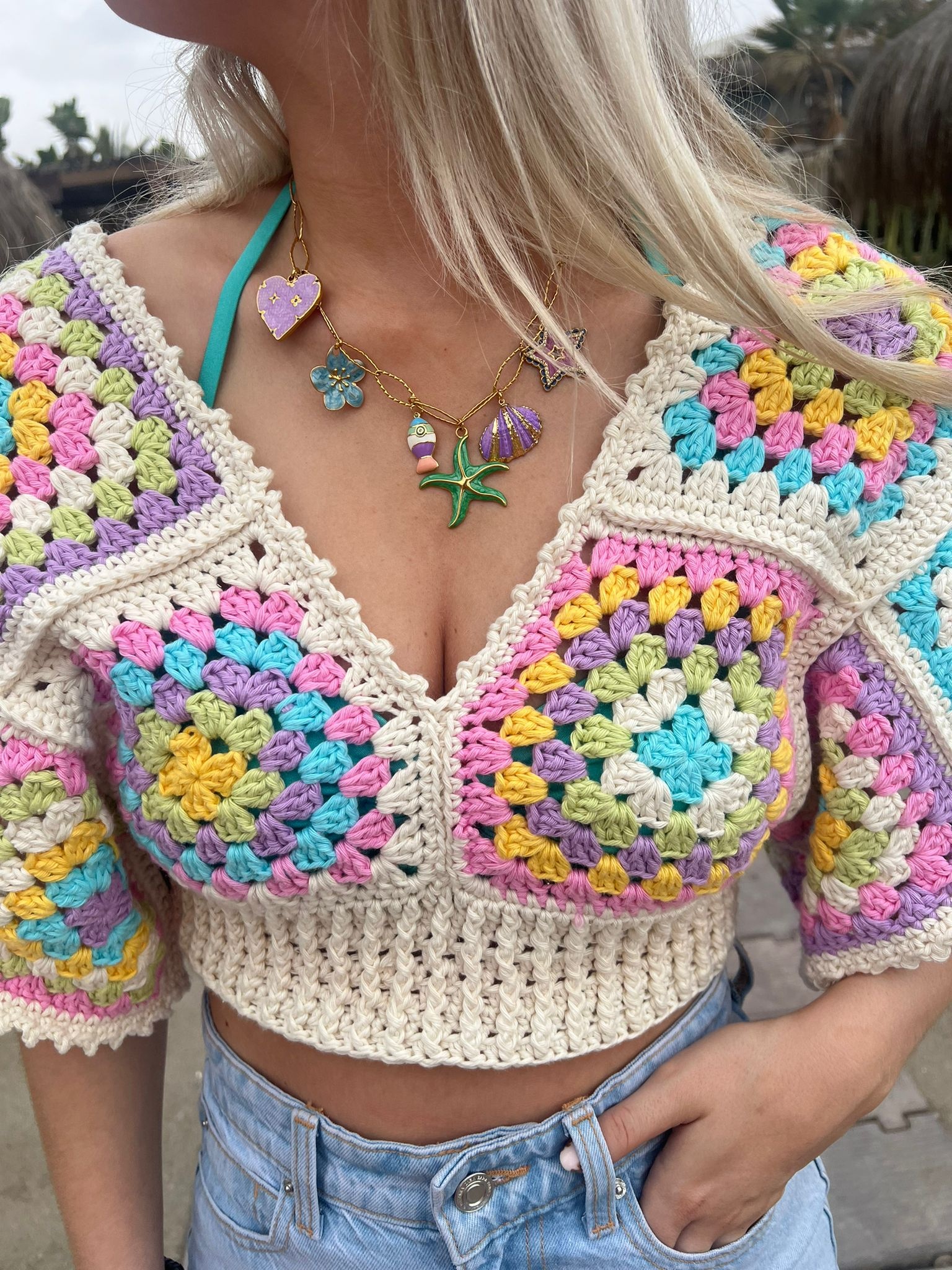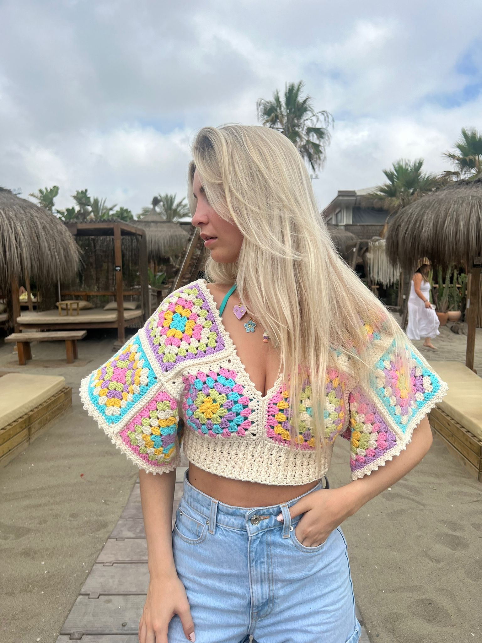 Hip Topje van kleurige granny’s , gehaakt van de Epic op haaknaald 4/4.5 mm Lees meer